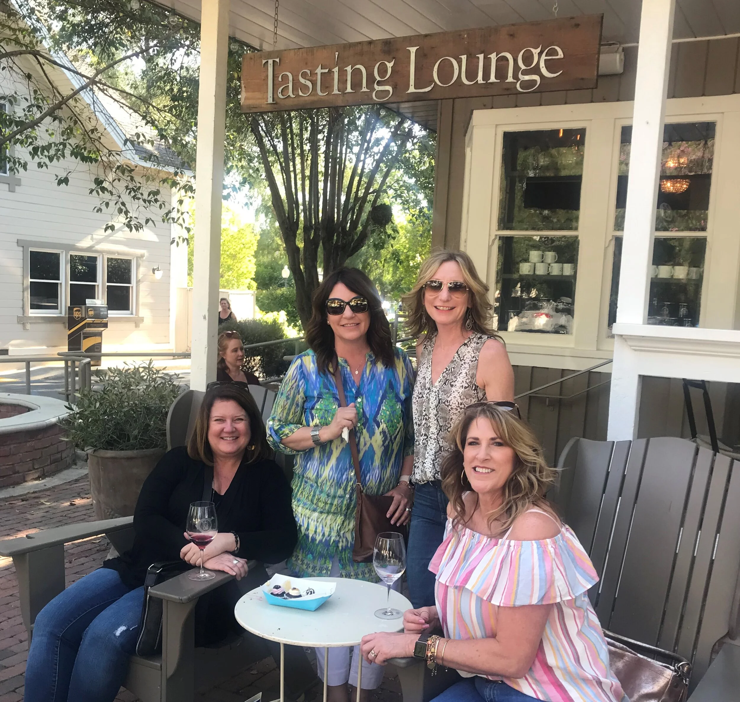 Sharon wine tasting with friends in Los Olivos