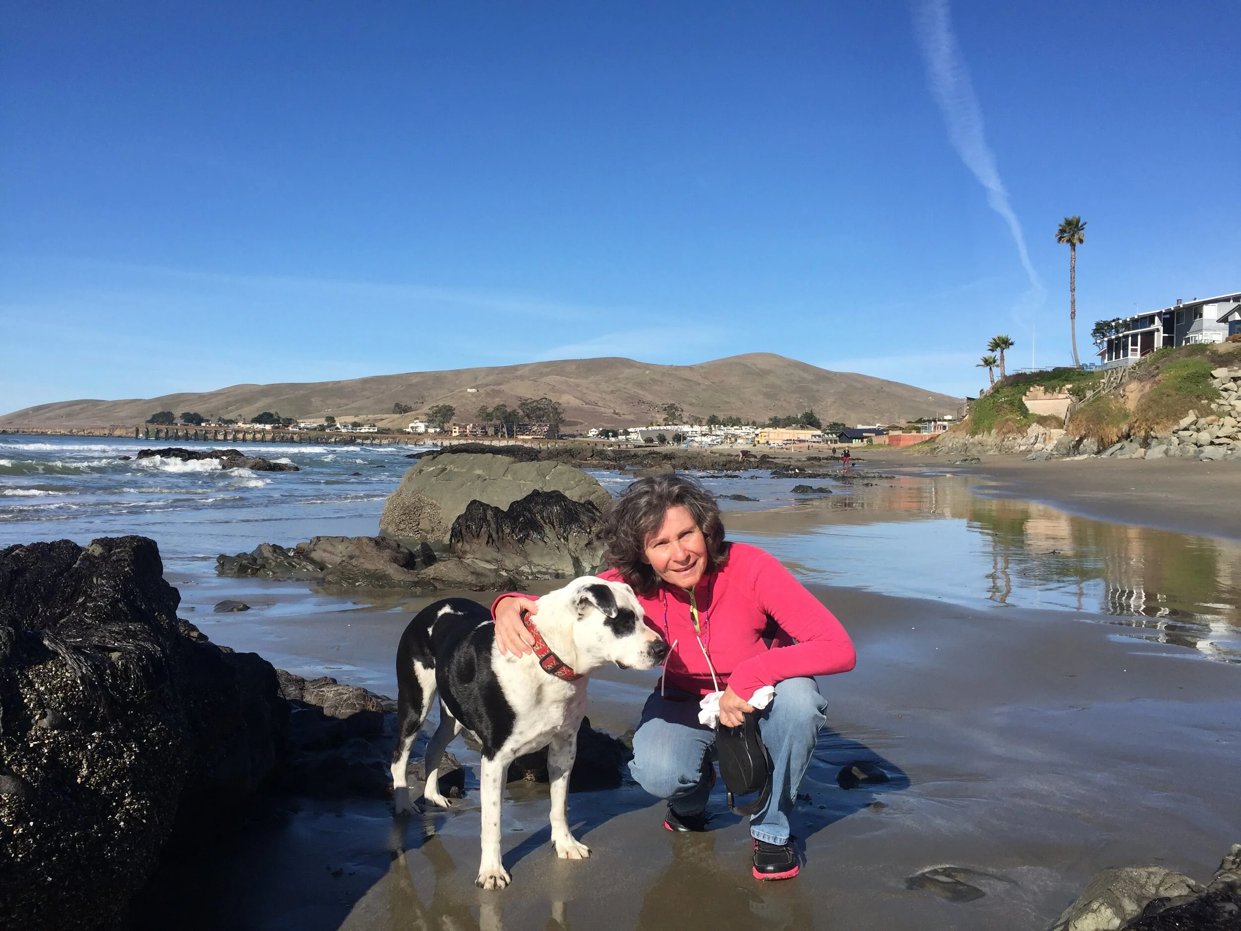 Vicki and Snoopy at the beach in Cayucos